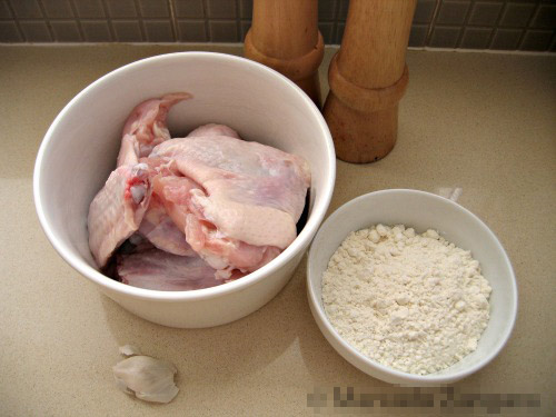 - 600g cánh gà- 1 muỗng canh dầu ăn- 2 tép tỏi, băm nhỏ- Bột mỳ- Muối và hạt tiêu
